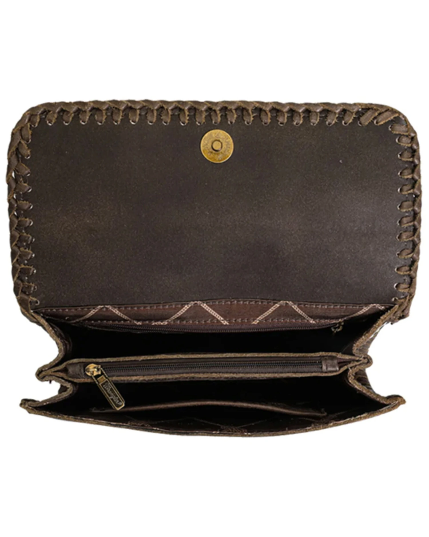- Genuine hair-on cowhide on the flap with magnetic button closure